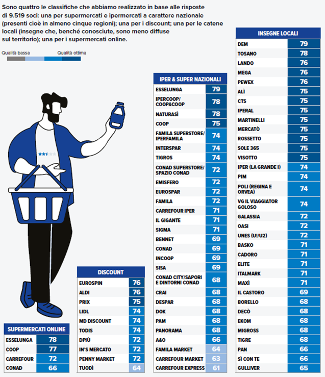 Guardando ai risultati complessivi il podio della categoria iper&super nazionali è occupato anche quest’anno da Esselunga, seguita a brevissima distanza da Ipercoop/Coop&Coop e NaturaSì, un’insegna votata all’alimentazione biologica, che conquista i consumatori più attenti all’ambiente con la qualità dei prodotti. Fra le insegne locali (ovvero presenti soltanto in alcune regioni) spiccano invece Dem, una catena con diversi supermercati dislocati tra Roma e Frosinone, che si aggiudica il primo posto, seguita da Tosano, un gruppo di 19 supermercati presenti nelle province di Verona, Vicenza, Brescia, Venezia, Mantova, Treviso, Ferrara, Padova e Udine, particolarmente attraenti per i loro prezzi. Passando poi ai discount, dove è il prezzo è il driver principale di acquisto, i preferiti risultano essere Eurospin e Aldi.