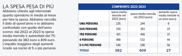 Alla fine del mese, il carrello della spesa è una delle voci di maggior incidenza sul portafoglio delle famiglie, soprattutto di quelle meno abbienti. In media una famiglia spende 409 euro, ben 27 euro in più rispetto al 2022, un rincaro che risulta via via più significativo tanto più aumenta il numero dei componenti del nucleo famigliare (vedi tabella).