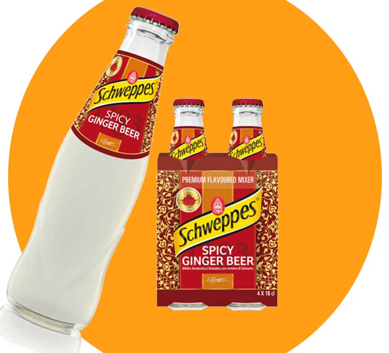 Completano l’unicità di Schweppes Spicy Ginger Beer, eleggendola l’ingrediente ideale per i cocktail più esclusivi, l’elevata gasatura; l’aroma intenso e piccante, particolare per il palato e per ogni mix; il gusto avvolgente, sviluppato su più livelli, dalla pungente nota di zenzero alla più sottile agrumata.