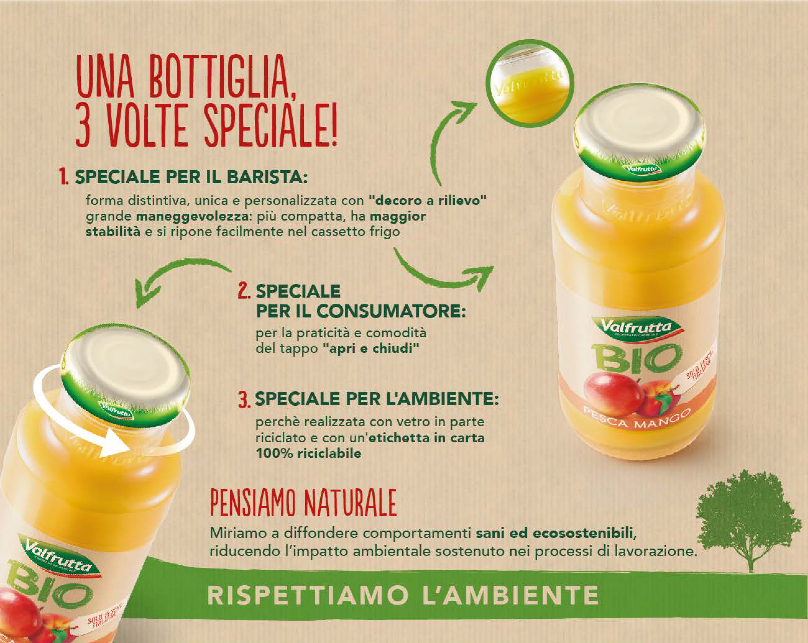 I gusti classici Pera, Pesca, Albicocca vantano il 100% di frutta italiana. La nuova bottiglia garantisce una maggiore praticità: dimensione compatta, maggiore stabilità e ottimizzazione degli spazi. Adozione del tappo twist-off che facilita l'apertura.